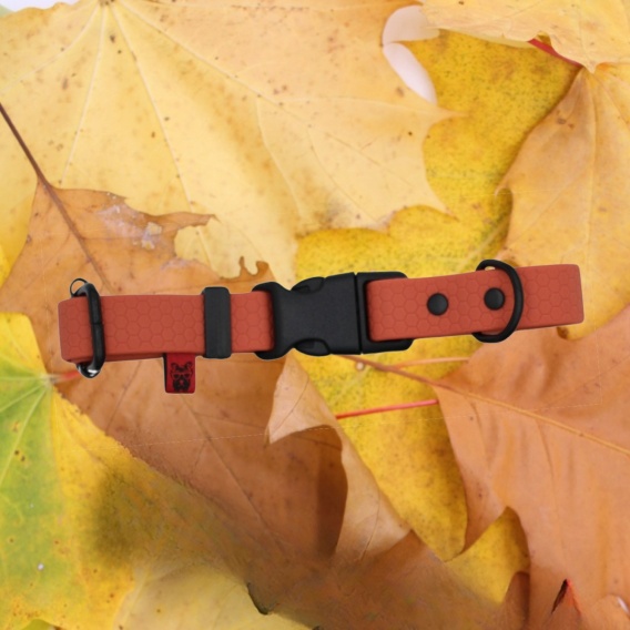 Obroża wykonana jest z innowacyjnej taśmy HEXA – powlekanego pasu parcianego o strukturze plastra miodu.