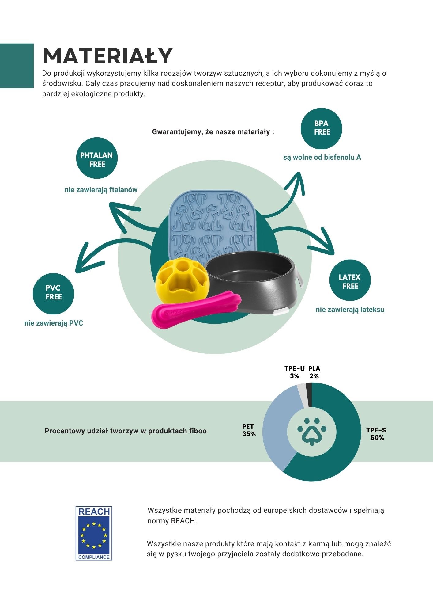 To, co szczególnie wyróżnia markę Fiboo, to materiały wykorzystywane do produkcji. Wszystkie tworzywa są starannie dobierane i spełniają europejskie normy REACH. Produkty nie zawierają BPA, PVC, ftalanów ani lateksu, a wszystkie akcesoria, które mogą mieć kontakt z jedzeniem lub psim pyszczkiem, są dodatkowo badane. Dzięki temu masz pewność, że wybierasz dla swojego pupila rozwiązania bezpieczne i przetestowane.