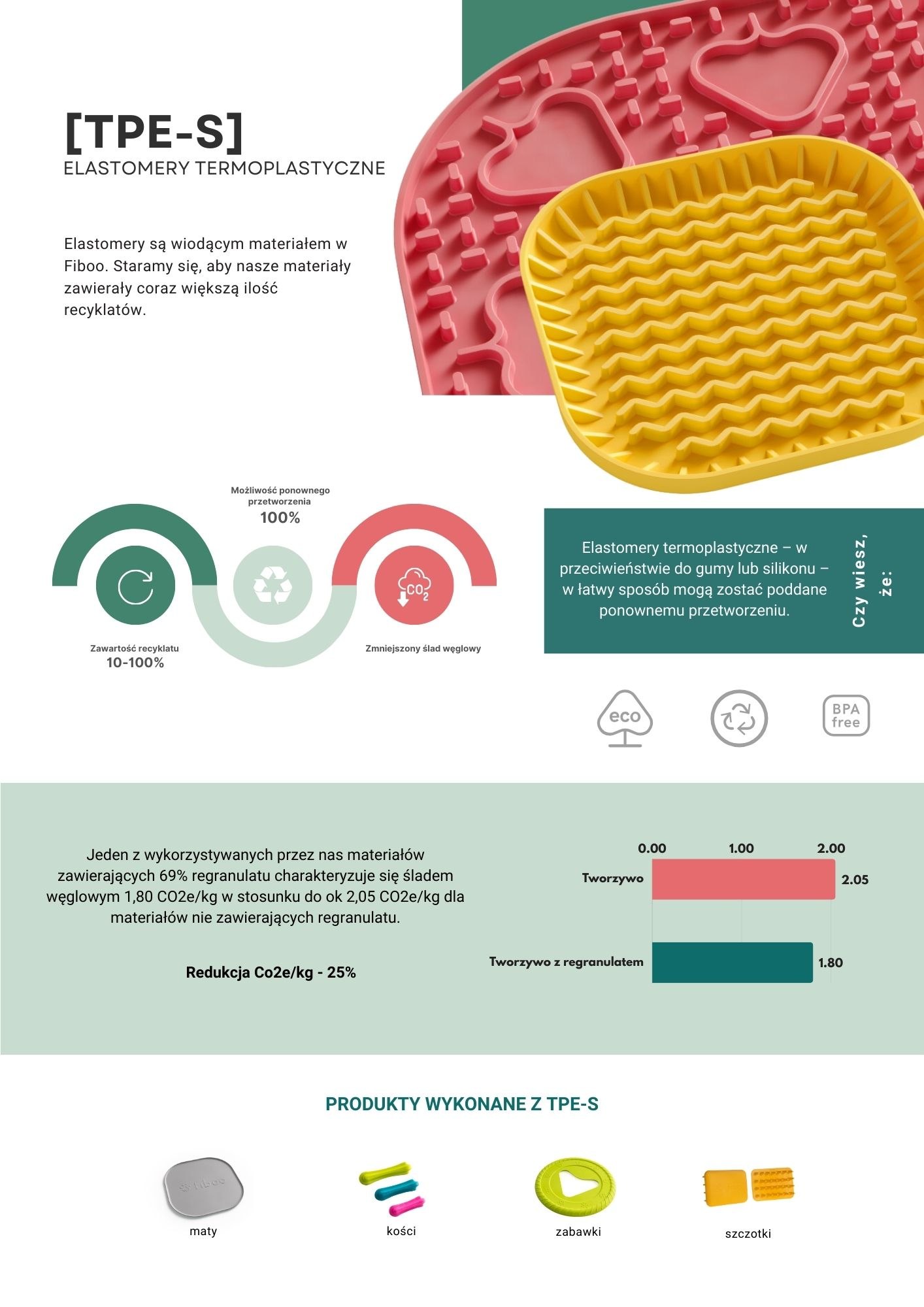Najważniejszym materiałem Fiboo jest TPE-S, nowoczesny elastomer termoplastyczny. Jest elastyczny, miękki w dotyku, bardzo trwały i w 100% nadający się do recyklingu. Co więcej – materiały Fiboo zawierają nawet do 100% recyklatu, a tworzywo z 69% powtórnie przetworzonego surowca generuje aż o 25% mniej CO₂ niż standardowe. To realny krok w stronę ekologicznej produkcji, który naprawdę robi różnicę.